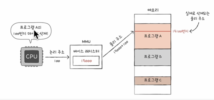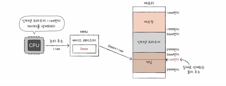 MMU는 논리 주소와 베이스 레지스터 값을 더하여 논리 주소를 물리 주소로 변환한다.