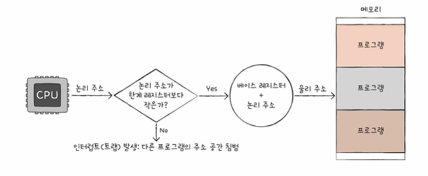 할당된 논리 주소를 초과한 논리 주소를 베이스 레지스터에 적용하여 작업을 실행하면 다른 프로그램이 존재하는 물리 주소에 침범하게 되어 안전하지 않다.