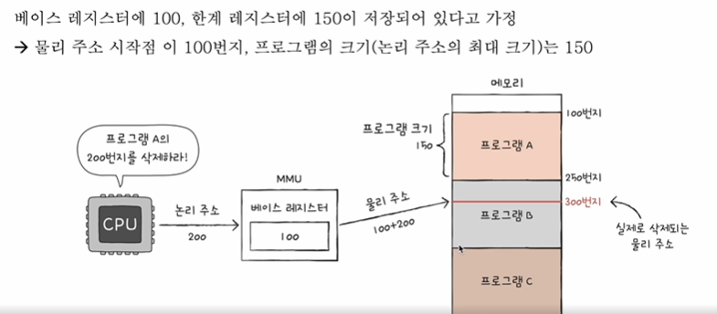 - 베이스 레지스터가 실행 중인 프로그램의 가장 작은 물리 주소를 저장하면, 한계 레지스터는 논리 주소의 최대 크기를 저장한다.