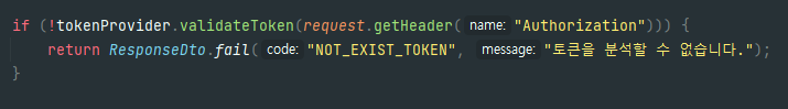 Authorization 이라는 헤더명을 가진 request의 Access토큰값을 tokenprovider의 validateToken 메소드를 활용하여 분해하고, 분해할 수 없으면 리턴값을 반환하고, 할 수 있으면 그대로 분해되어 출력된 유저 정보들을 활용할 계획이었다.