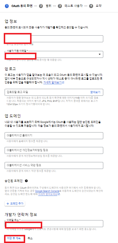 웹 어플리케이션 명, 사용자 지원 이메일, 개발자 연락처 정보(개인 메일)을 작성하고 저장 후 계속해줍니다.