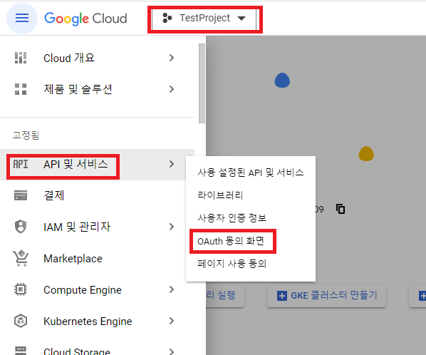그 다음 왼쪽 메뉴 버튼의 API 및 서비스 항목에 존재하는 OAuth 동의 화면을 눌러줍니다.