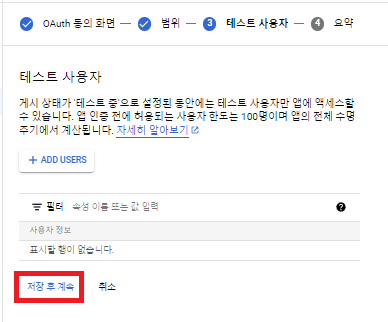 테스트 사용자도 마찬가지로 아무런 수정 사항 없이 저장 후 계속을 눌러줍니다.