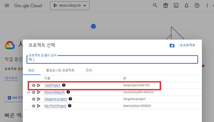 만들기가 성공하면 프로젝트 리스트에 방금 만든 프로젝트가 등장하게 됩니다.
