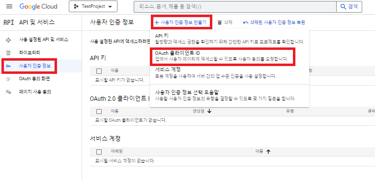 사용자 인증 정보 항목에서 사용자 인증 정보 만들기 버튼을 눌러 OAuth 클라이언트 ID를 생성해주도록 합니다.