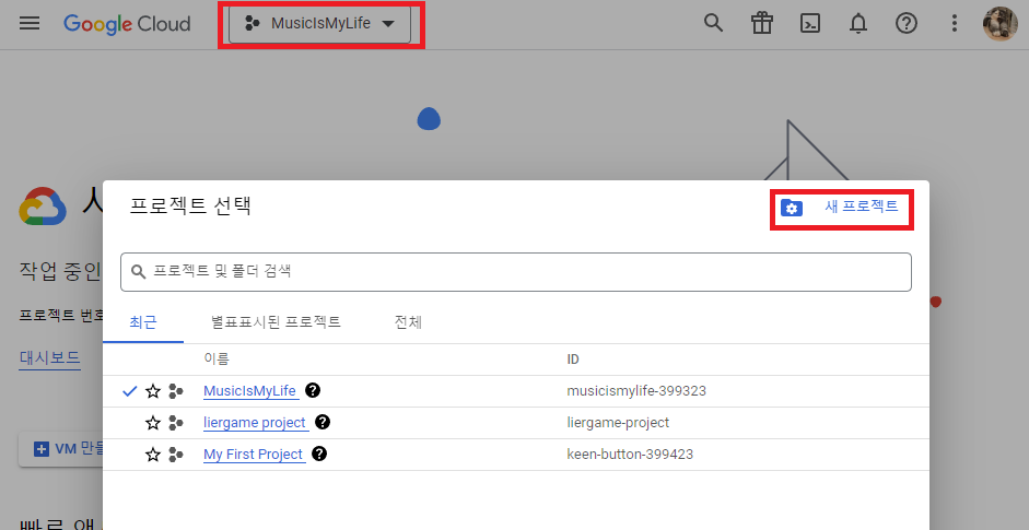 계정을 만들고 난 이후에 상단에 존재하는 프로젝트 버튼을 눌러줍니다.