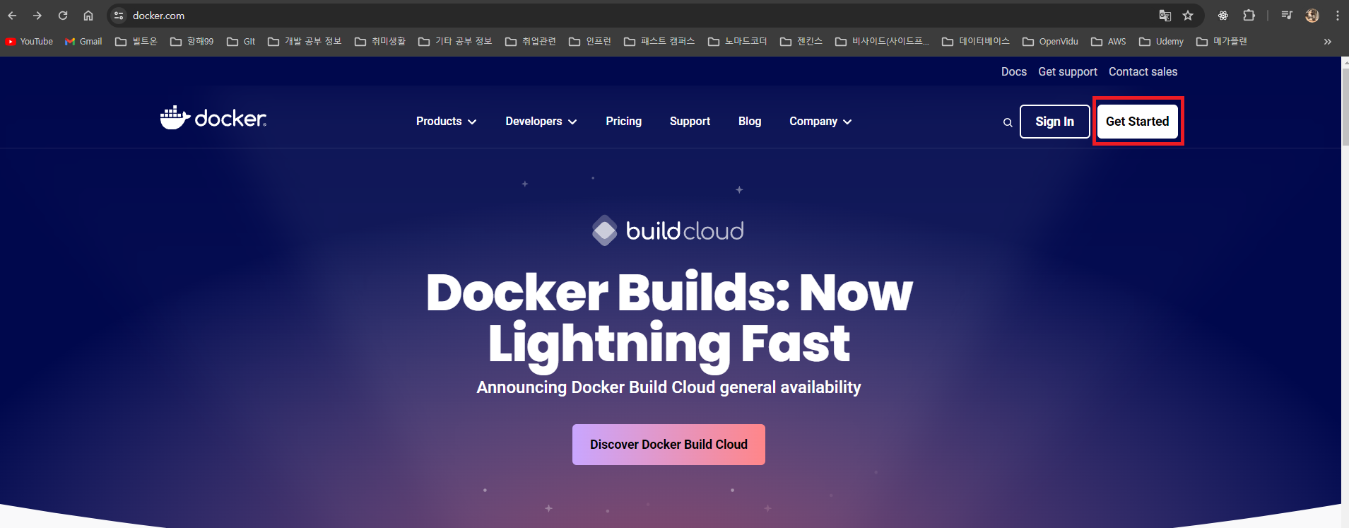 Docker 사이트에 들어가서 Get Started 버튼을 눌러줍니다.