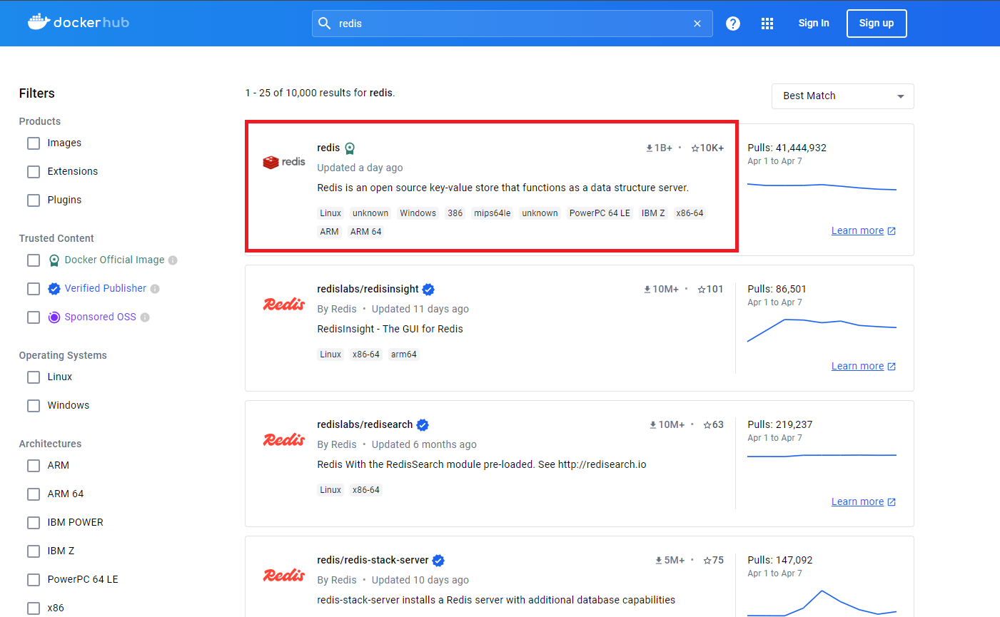 Hub에 Redis를 입력하여 검색한 뒤, 이름에 공식 마크가 달린 Redis 항목을 선택해줍니다.