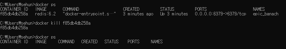 docker ps로 Container ID 를 확인한 뒤, docker kill {Container ID} 명령어를 입력하면 컨테이너를 종료할 수 있습니다.