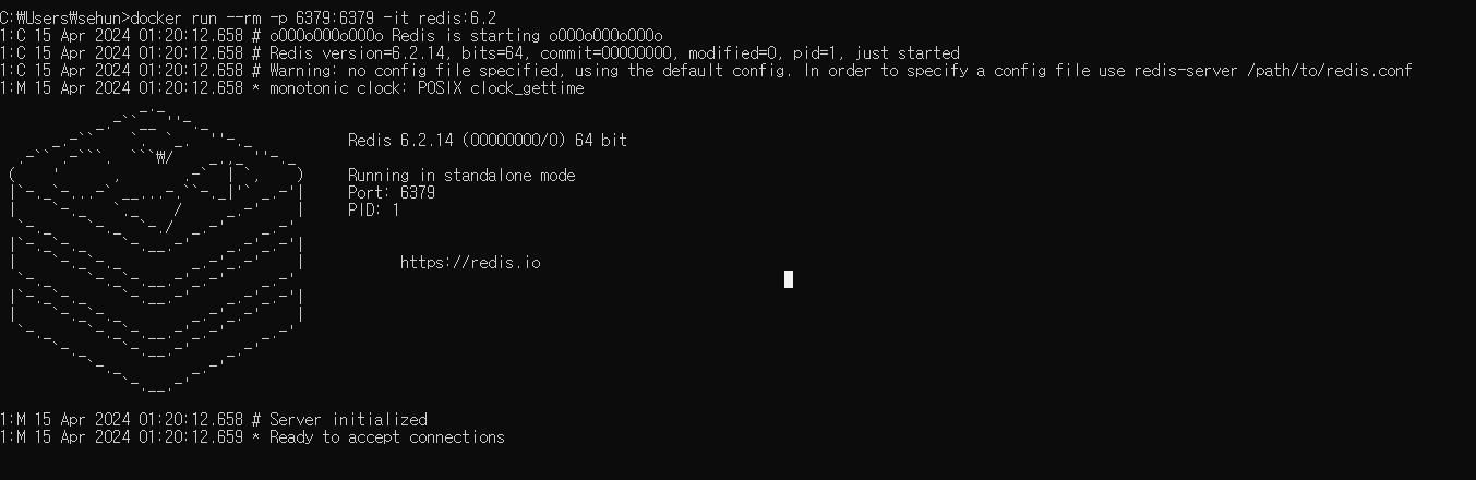 docker run --rm -p 6379:6379 -it redis:{버전} 명령어를 입력하면 설치한 버전의 Redis 컨테이너가 로컬 환경 포트 6379에서 docker의 6379 포트로 매핑하여 실행되게 됩니다.