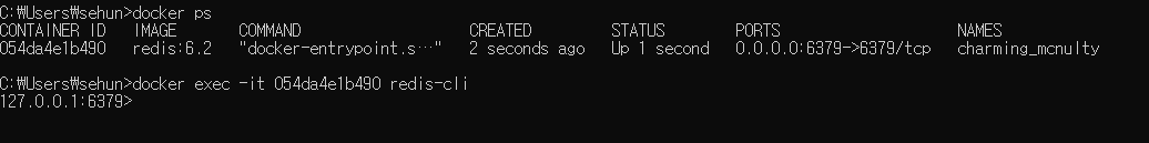 docker exec -it {Container ID} redis-cli 명령어를 통해 Redis 클라이언트에 접속할 수 있습니다.